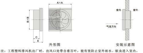 注:工程塑料排風機出廠時,出風口處帶自垂百葉,能在效防止室外雨水、蚊子進入室內(nèi)。