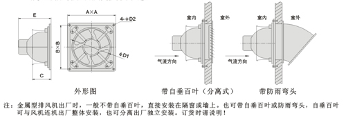 注:金屬型排風機出廠時,一般不帶自百葉,直接安裝在隔窗或墻上。也可帶自垂百葉或防雨彎頭,自垂百葉可與風機連機出廠整體安裝,也可分離出廠獨立安裝。訂貨時請說明!