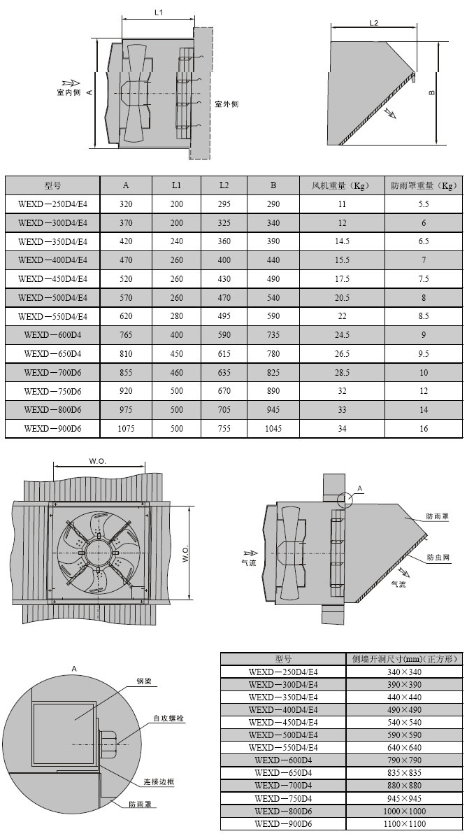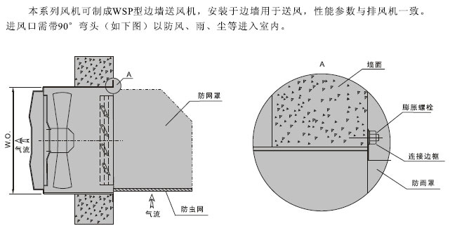 WEXD(WEX)系列風(fēng)機(jī)一般用于邊墻壁式排風(fēng),配設(shè)45°防雨罩(或特殊制造成60°)和防蟲網(wǎng)(夜間可防止昆蟲循燈光飛入車間)。可按需要制成邊墻送風(fēng)機(jī)型號(hào)為DWSP(WSP),配設(shè)90°防雨罩(防風(fēng)、雨、塵)和防蟲網(wǎng)(夜間可防止昆蟲循燈光飛入車間)。附件選配:重力式止回風(fēng)閥(可確保車間在風(fēng)機(jī)不開時(shí)保持與室外隔絕),訂貨時(shí)注明。 |