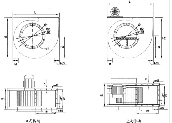 CDF-I 型風機采用A式直聯和E式皮帶傳動兩種結構形式,前傾多翼式離心葉輪。配用防爆電機和鋁(不銹鋼)材質葉輪,可制成防爆型。具有風量大、噪聲低、結構緊湊、安裝方便等優點,適用于單位食堂、飲食店、賓館酒樓等廚房排油煙,及廠礦企業、民用建筑等場合的送排風。