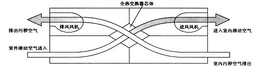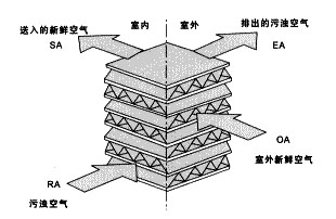 當室內空調回風和新風分別呈正交叉方式流經換熱芯體,由于平隔板兩側氣流存在著溫度差和水蒸汽壓差,兩股氣流間同時呈現傳熱傳質現象,引起全熱交換過程。這種過程是通過平隔板完成的,所以屬透過型全熱交換現象。當安裝在系統上的全熱交換新風機在夏季運行時,新風從空調回風中獲得冷能使溫度降低,同時被空調回風干燥,使新風含濕量降低;在冬季運行時新風從空調回風獲得熱能使溫度升高,同時被空調回風干燥,使新風含濕量降低;在冬季運行時新風從空調回風獲得熱能使溫度升高,同時被回風加濕,使新風含濕量增加,就這樣通過換熱芯體的全熱交換過程新風從空調回風中回收能量。