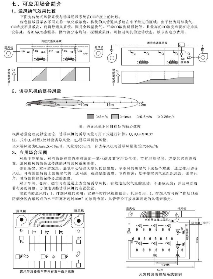 應(yīng)用:地下停車(chē)場(chǎng)、體育館、車(chē)間、倉(cāng)庫(kù)、商場(chǎng)、超市、娛樂(lè)場(chǎng)所等大面積場(chǎng)合的誘導(dǎo)通風(fēng)